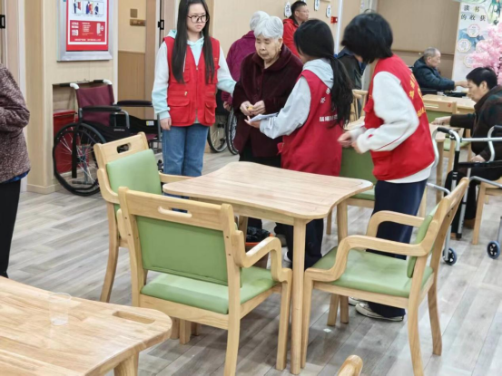 活动伊始,志愿者们早早来到康养院,搬桌椅、布置场地,细心地搀扶老人就座。对于腿脚不便、乘坐轮椅的老人,志愿者俯身陪伴在侧,轻声询问需求,确保每位长者都能舒适地参与到活动中来。