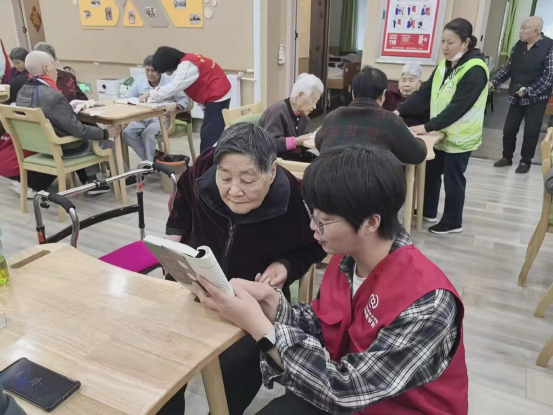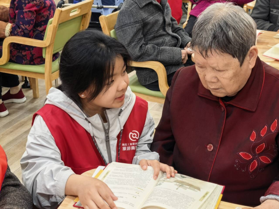 在自由伴读与暖心交流环节,志愿者们陪着老人一起翻阅书籍,聊聊生活家常。有的老人谈起年轻时的奋斗故事,有的说着在康养院的日常,还有的主动分享起十堰当地的老照片和老物件背后的记忆。志愿者们的耐心倾听与真诚回应,让平日里有些孤独的老人打开了话匣子,现场气氛轻松又温馨。学院党总支始终将“一老一小”服务作为党建带团建的重要实践阵地,此次活动中,党员冲锋在前、团员积极响应,共同诠释了新时代青年的责任与担当。这种跨越代际的真诚交流,正是“AI+拾焰传薪”项目所倡导的“数智赋能代际共融”理念的生动实践。