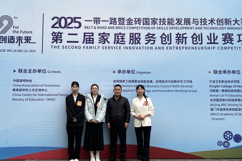 2025年12月19日至22日,2025一带一路暨金砖国家技能发展与技术创新大赛第二届家庭服务创新创业赛项全国总决赛在宁波卫生职业技术学院圆满落幕。我校旅游商贸学院现代家政服务与管理专业师生团队在比赛中表现优优异,分获高职组三等奖与教师组三等奖,展现了我校在家庭服务专业教育与创新实践方面的扎实成果。