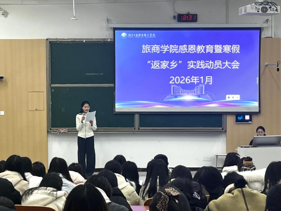 1月6日晚,旅游商贸学院于3101教室隆重举行感恩教育暨寒假“返家乡”社会实践活动动员大会。学院学工口全体教师及各班级学生代表齐聚一堂,在感悟感恩文化、明晰实践要求的氛围中,凝聚奋进共识,激发奉献热情。