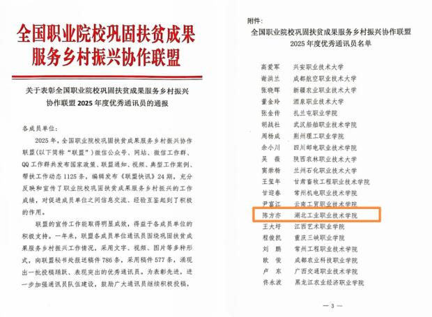 此次获评优秀通讯员,是对我校乡村振兴宣传工作的鼓励与鞭策。下一步,学校将依托联盟平台,进一步深化校地合作、产教融合,充分发挥职业教育专业与人才优势,持续打造服务乡村振兴的典型案例与特色品牌,为全面推进乡村振兴贡献更多“湖工职”智慧与力量。