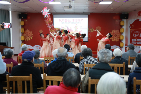 为弘扬敬老爱老传统美德,传承非遗文化精髓,2026年3月15日下午,旅游商贸学院学生党支部、分团委组织入党积极分子及晨曦助老服务队成员赴十堰太和和众养老中心,开展“凤鸣慈心,非遗暖夕”郧阳凤凰灯舞慰问活动,为院内老人送去非遗盛宴与暖心关怀。